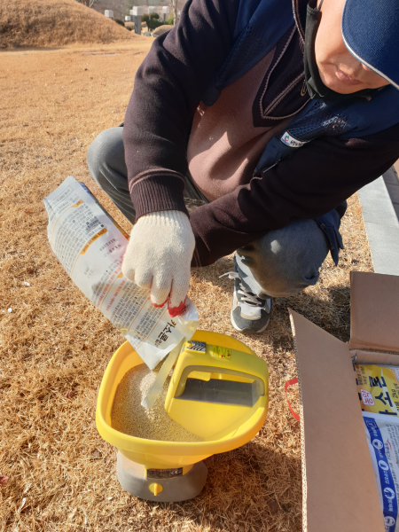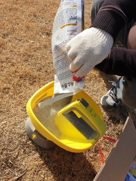 살포기에 제초제를 넣고, 각 구역마다 균일하게 입상형 제초제를 살포합니다.