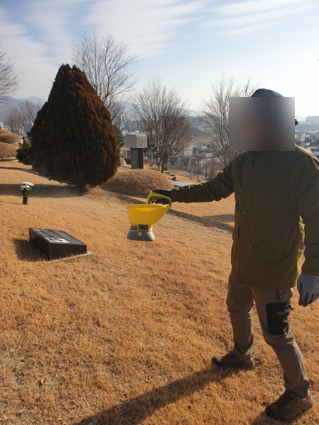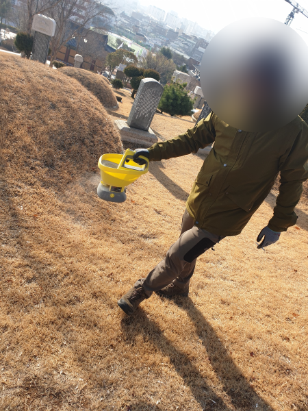 (사진으로는 잘 보이지 않지만, 모래알갱이 형태의 제초제가 넓게 퍼지면서 뿌려지고 있다는...^^)