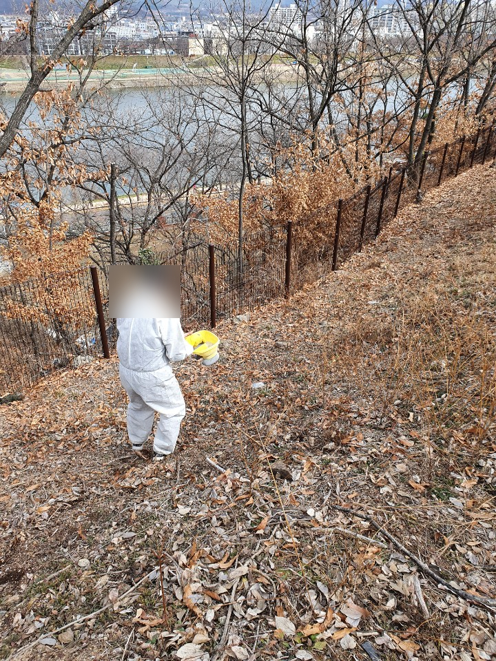 평평한 잔디밭 이외에도 - 절개지와 공원 외곽까지 꼼꼼하게 제초제를 살포합니다.