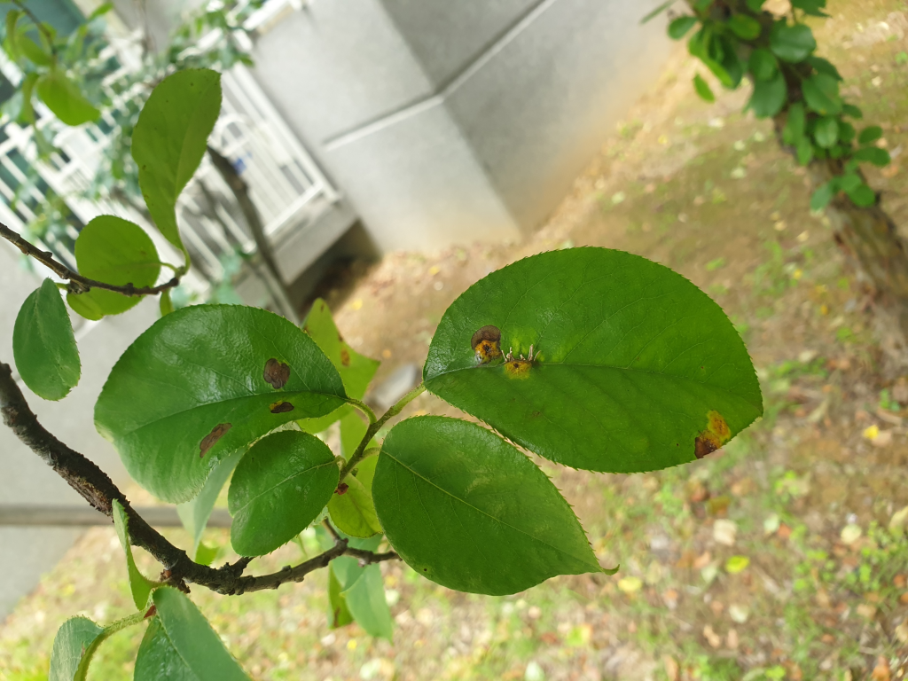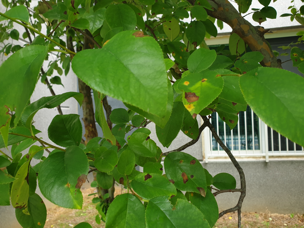 적성병(붉은별무늬병) 피해를 입은 모과나무입니다.