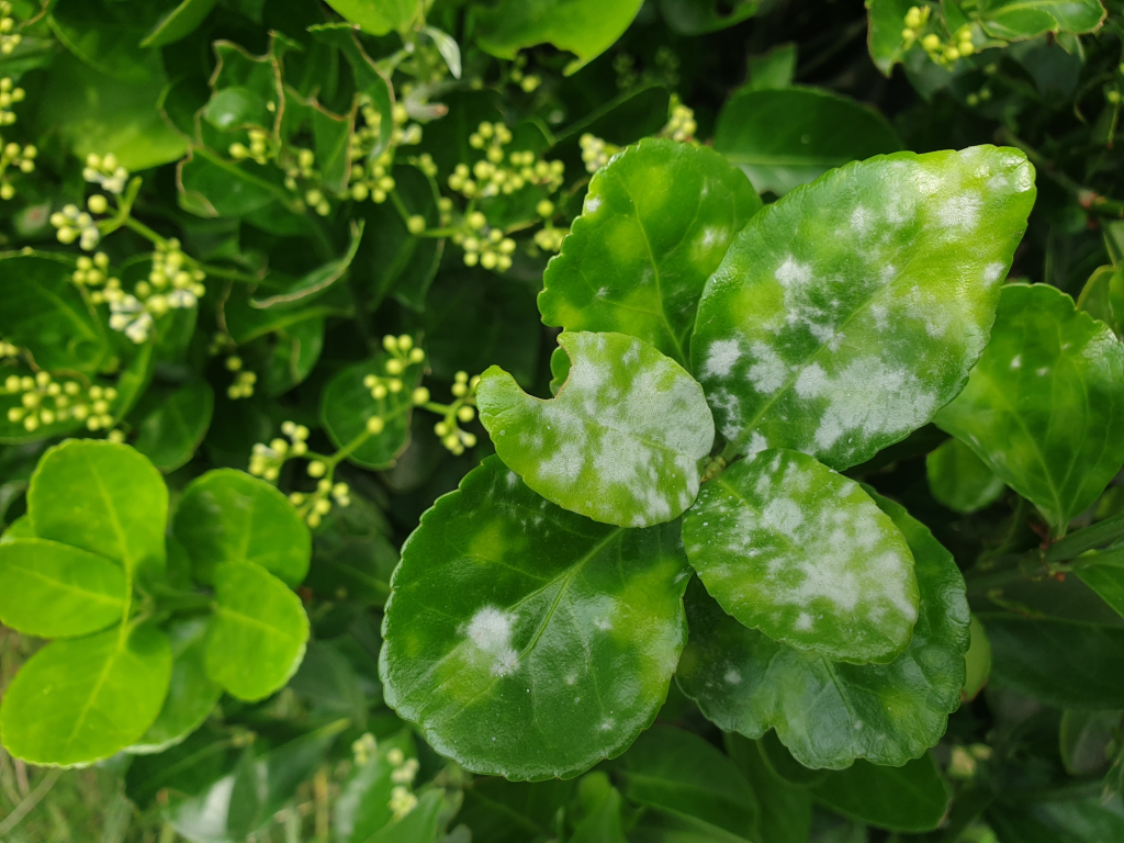 차폐의 용도로 식재된 사철나무 생울타리에서 발견한 흰가루병의 모습입니다.