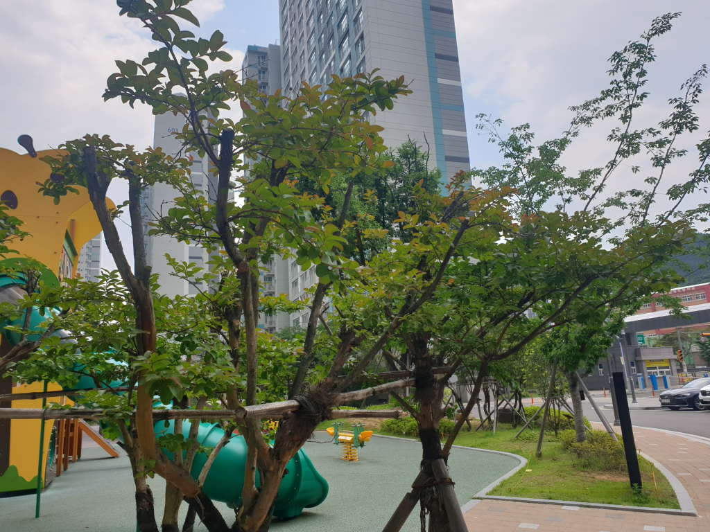 아파트 화단 내 식재된 모과나무, 배롱나무, 벚나무 등 조경수의 수세가