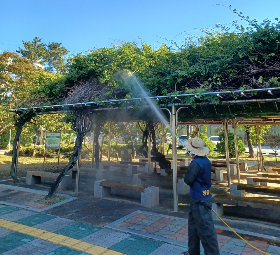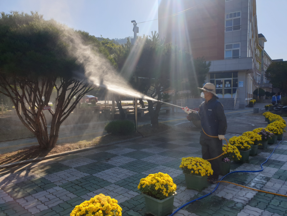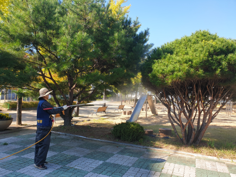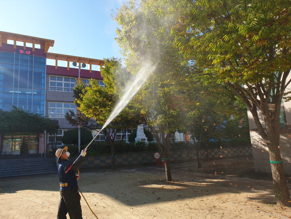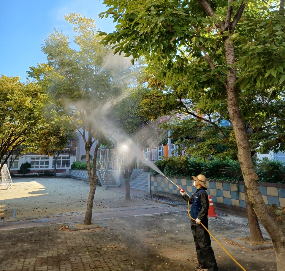 교문부터 운동장, 학생들이 쉬는 쉼터까지 꼼꼼하게 약제를 살포해줍니다.