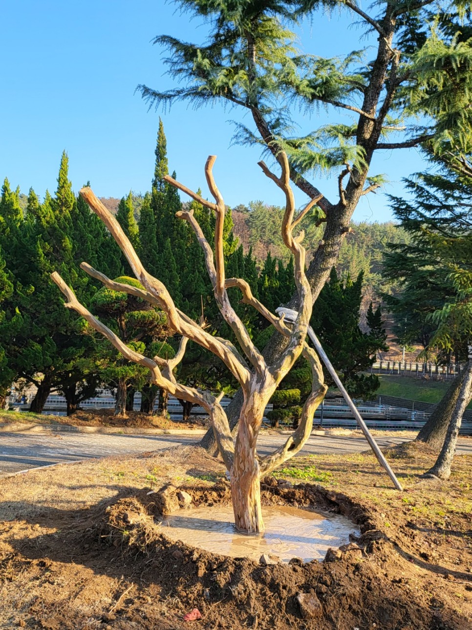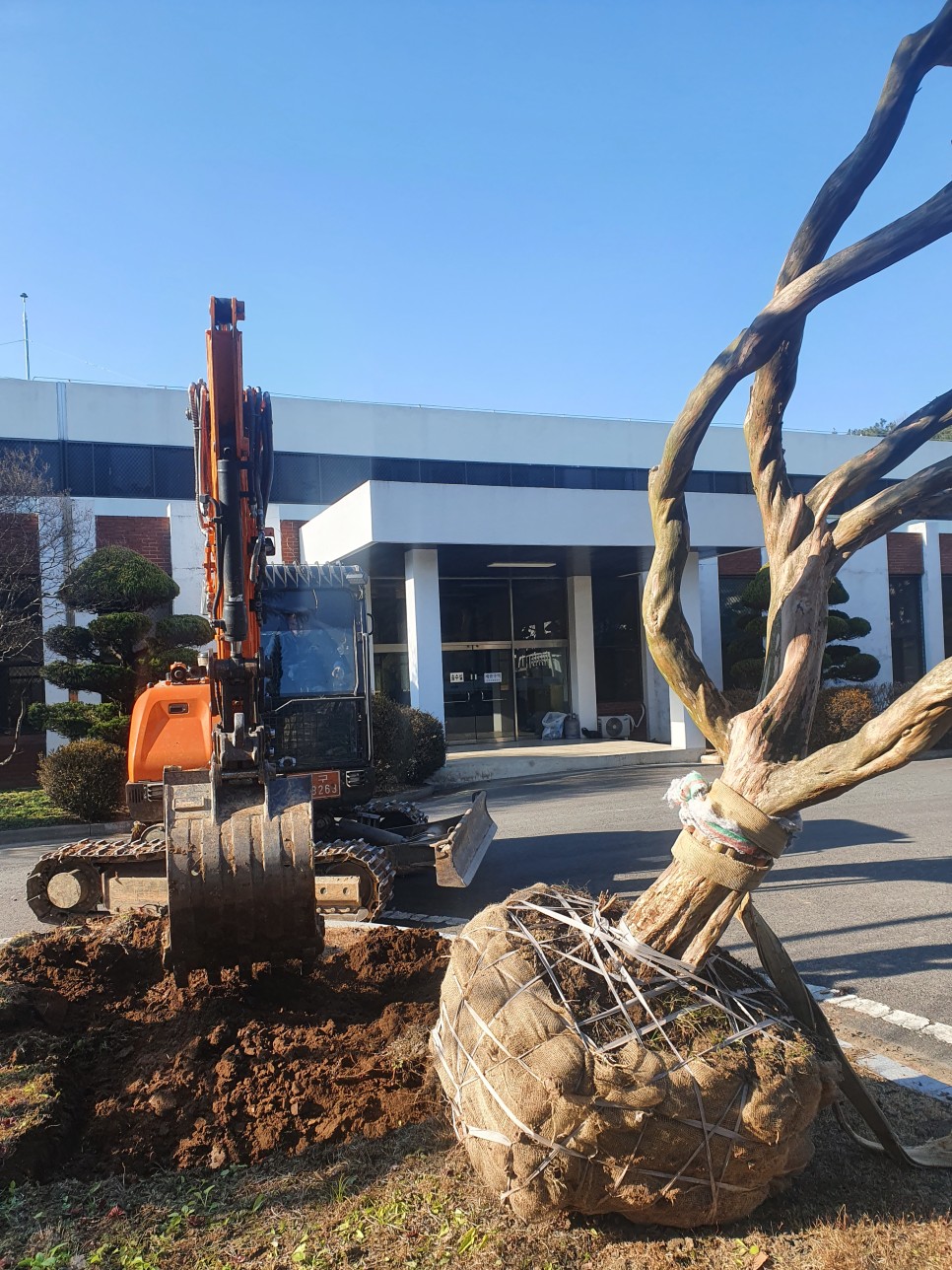 벌채 작업 이후에는, 기관 내 식재된 [배롱나무, 향나무]의