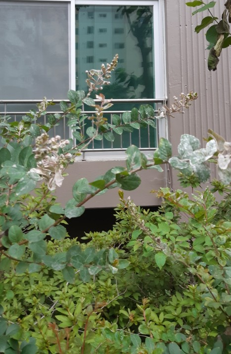 배롱나무 흰가루병은, 배롱나무가 식재되어 있는 아파트 단지내에서 친근하게(?) 볼수 있는 매후 흔한 병입니다.