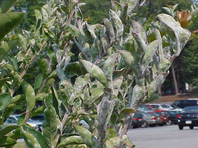생육에 크게 영향을 주지는 않으나 상기 사진에서 보시는것과 같이 엽면이 변색되어 조경수들의 미관이 크게 손상됩니다.