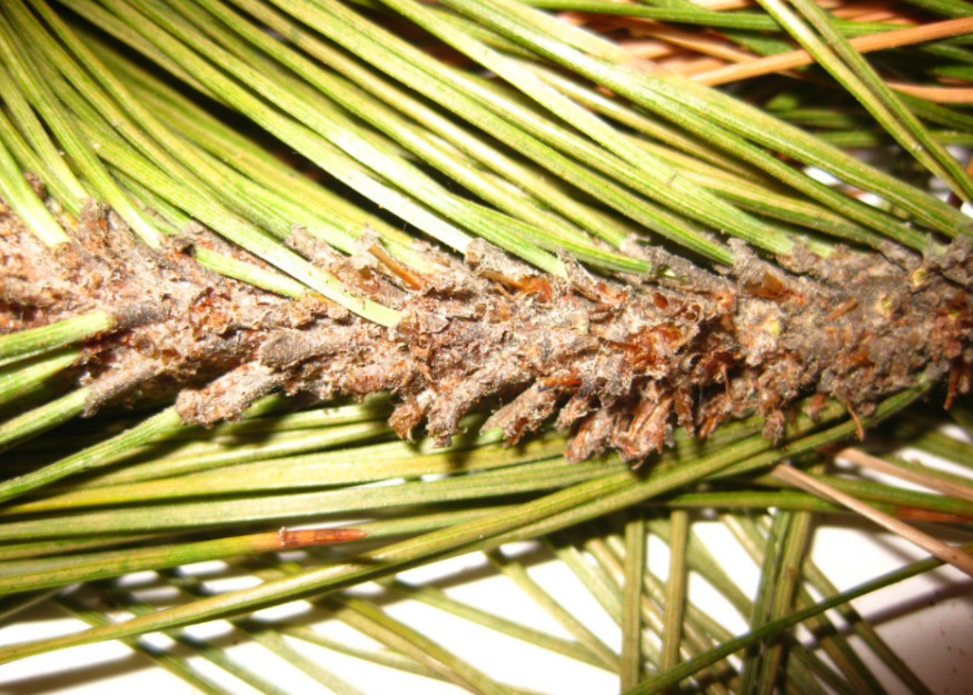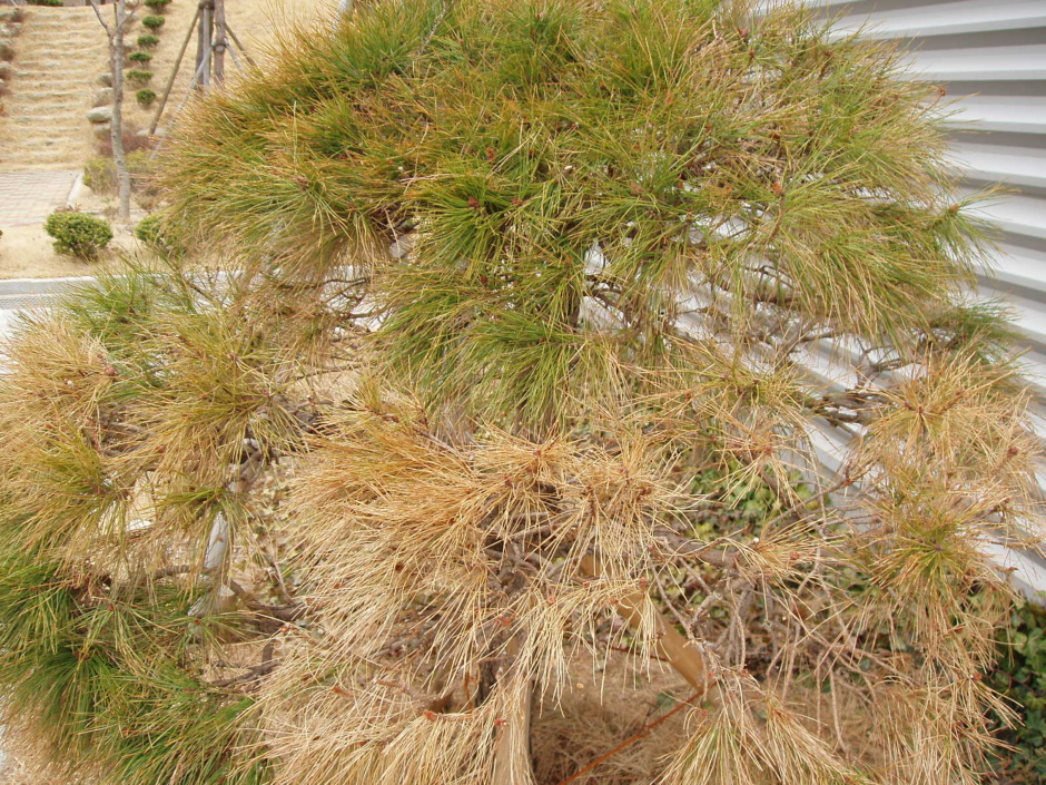 (응애 피해목 사진 - 소나무의 갈변 및 고사가 빠르게 진행)