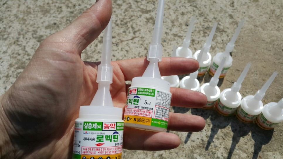 이후 아래쪽으로 45도 방향으로 뚫린 주입구에 수간주사제를 꽂은다음