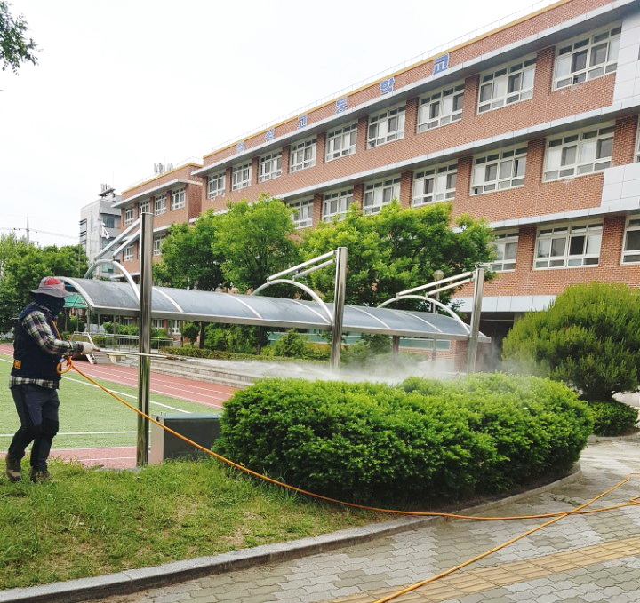 방제작업이 진행되는 교내의 내부, 외부 및 외곽까지 꼼꼼히 작업을 진행하고