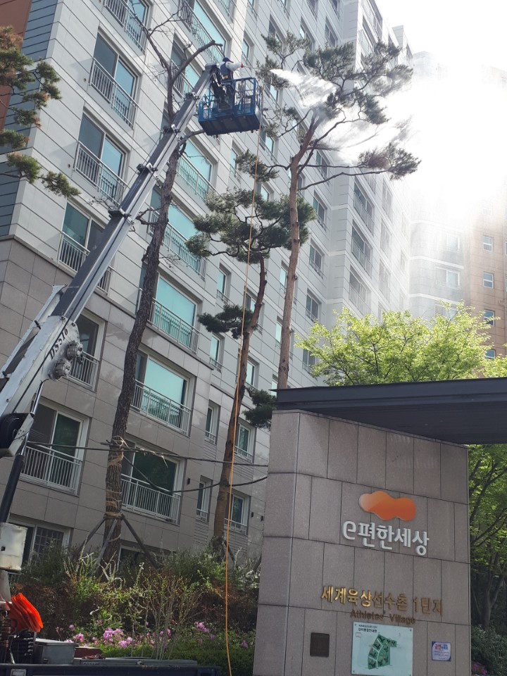 우선적으로 수고가 높은 소나무를 대상으로 고소차량을 이용하여 방제작업을 진행하였습니다.