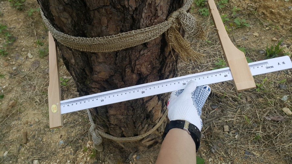 가장 먼저 작업구역내 소나무들의 규격을 측정합니다.