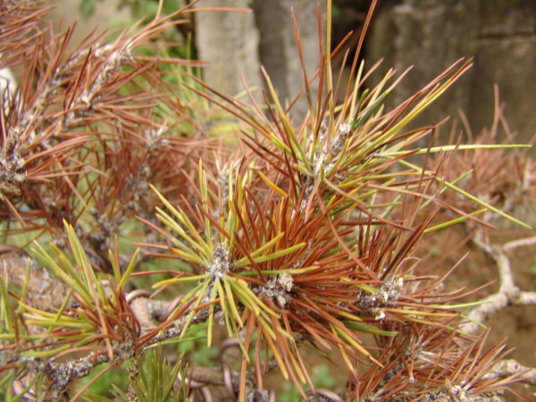 (응애 피해목 사진 - 소나무의 갈변 및 고사가 빠르게 진행)