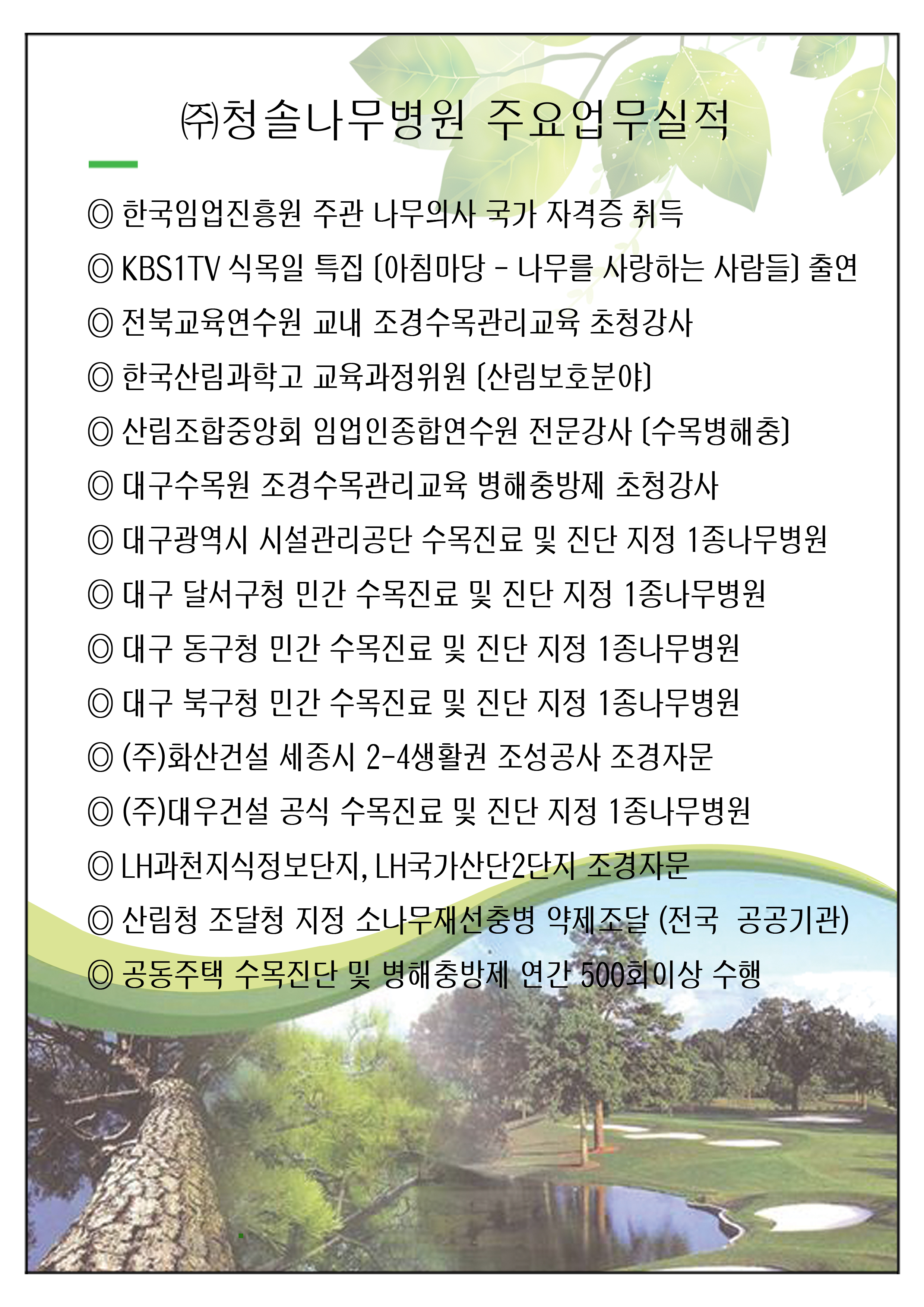 (주)청솔나무병원은 공동주택을 대상으로 작업을 전문적으로 수행할 수 있는 산림법인 정식허가 업체이며, 설립 이래 연평균 500여 건 이상의 작업수행 실적과 더불어 공공기관 작업수행, 관급 공사 약제납품 등 전문성을 더욱 키우기 위해 많은 노력을 하고 있습니다.