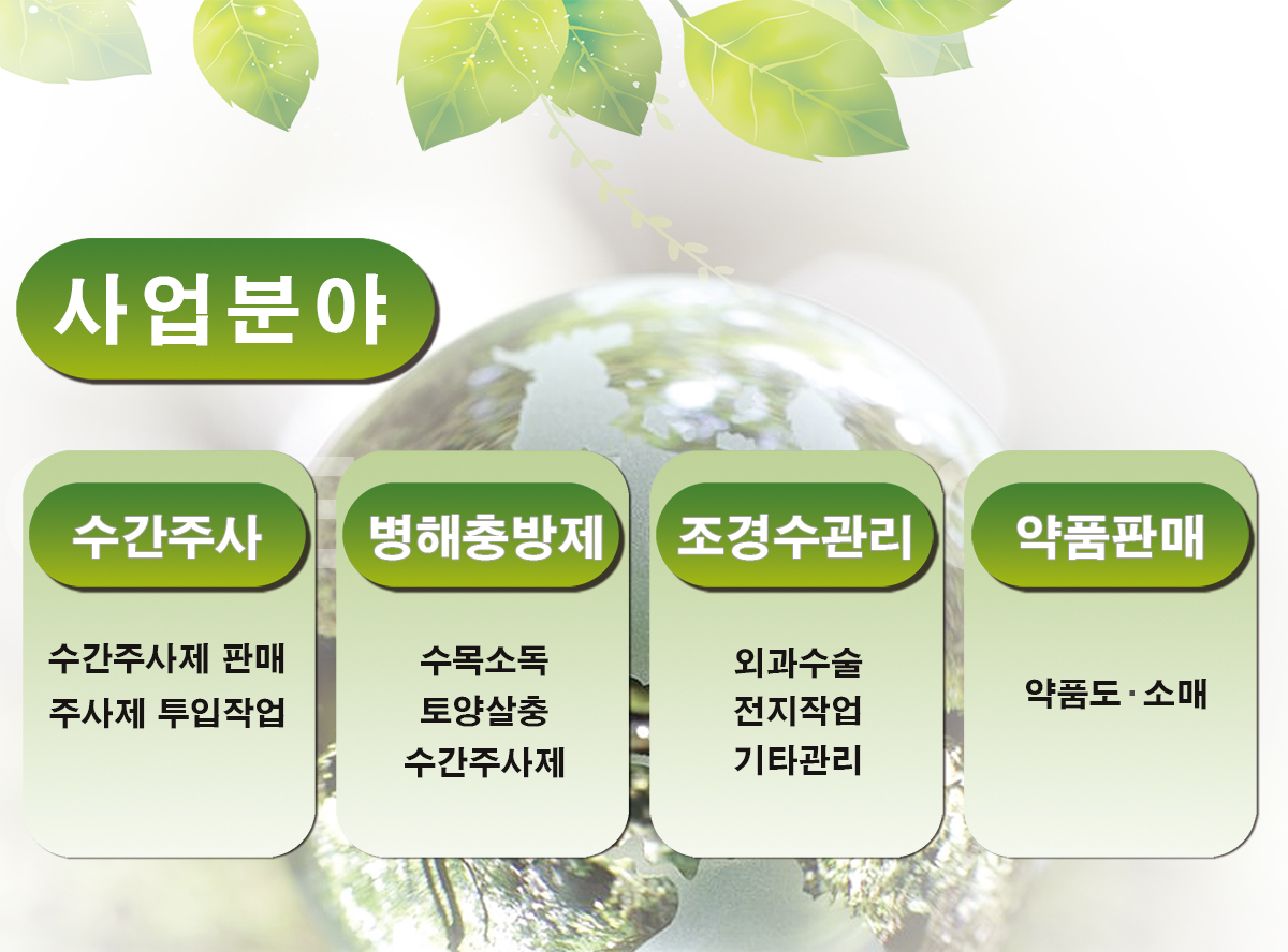 이에 믿고 찾아주신다면, 그간 관리업계에서 현역으로 종사하며 얻은 노하우와 실력을 바탕으로 수목관리 및 방제에 대한 합리적인 견적과 만족도를 제공할 수 있도록 최선을 다하여 기존 업체들과 다른 경쟁력을 보여드리겠습니다.